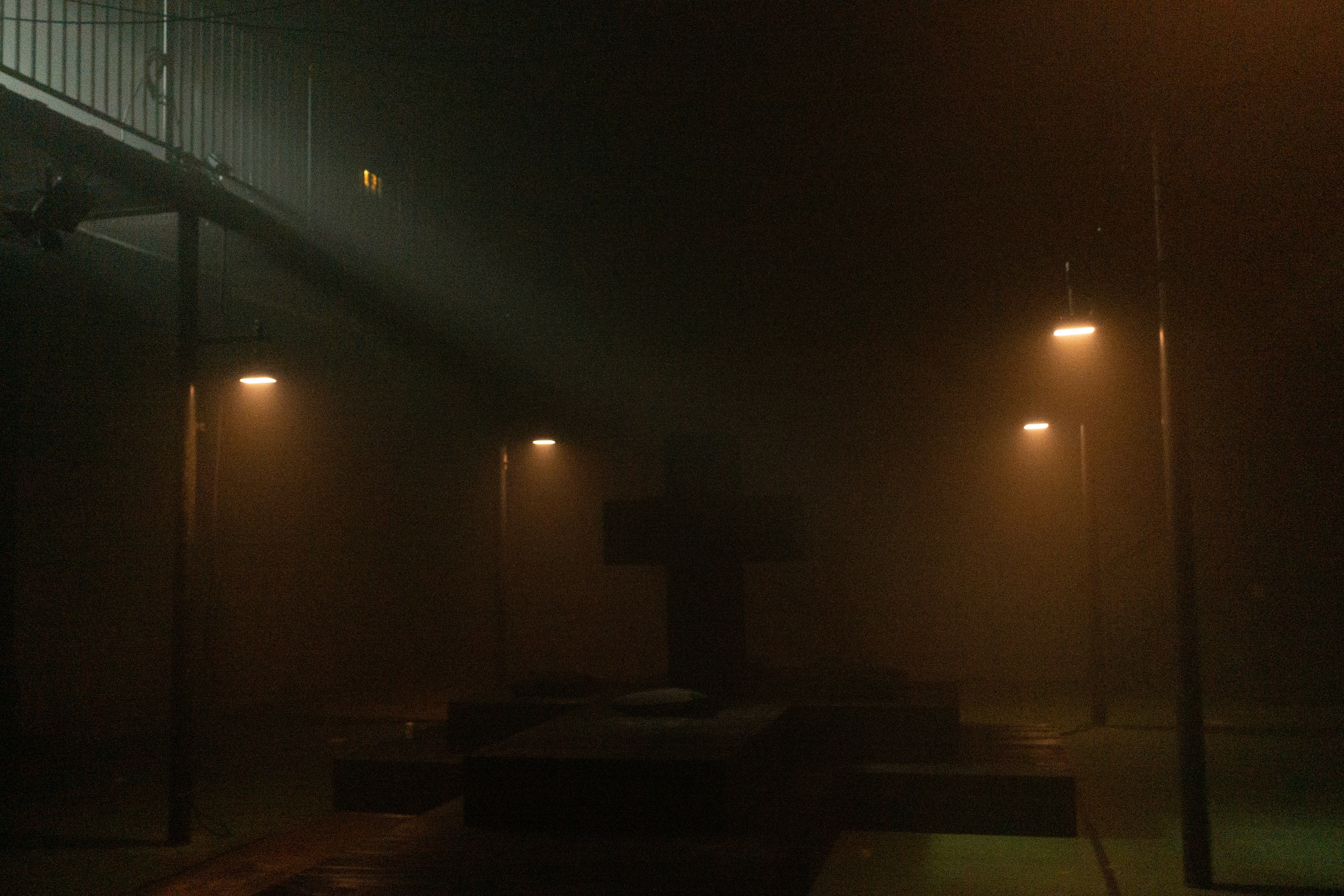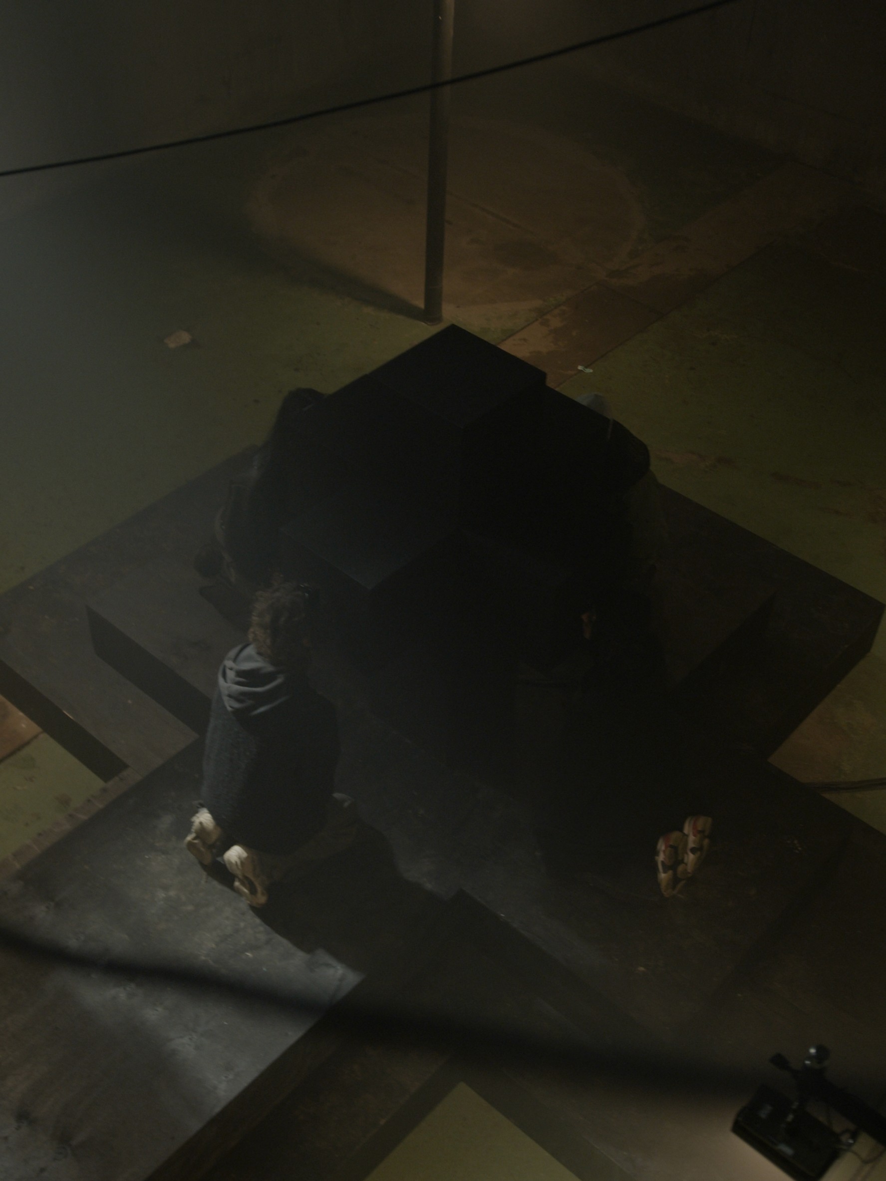 :the film was screened within the solid shadow of a 4-dimensional cube. A cross-shaped structure, finished in a matte black paint that absorbed 99.905% of light, created the illusion of a shadow with volume. Each of the 4 protruding boxes contained a viewfinder into the shadow itself, where the film could be viewed. The film’s score resonated through the space as deep sub-bass, with the full composition heard only from within the installation itself.