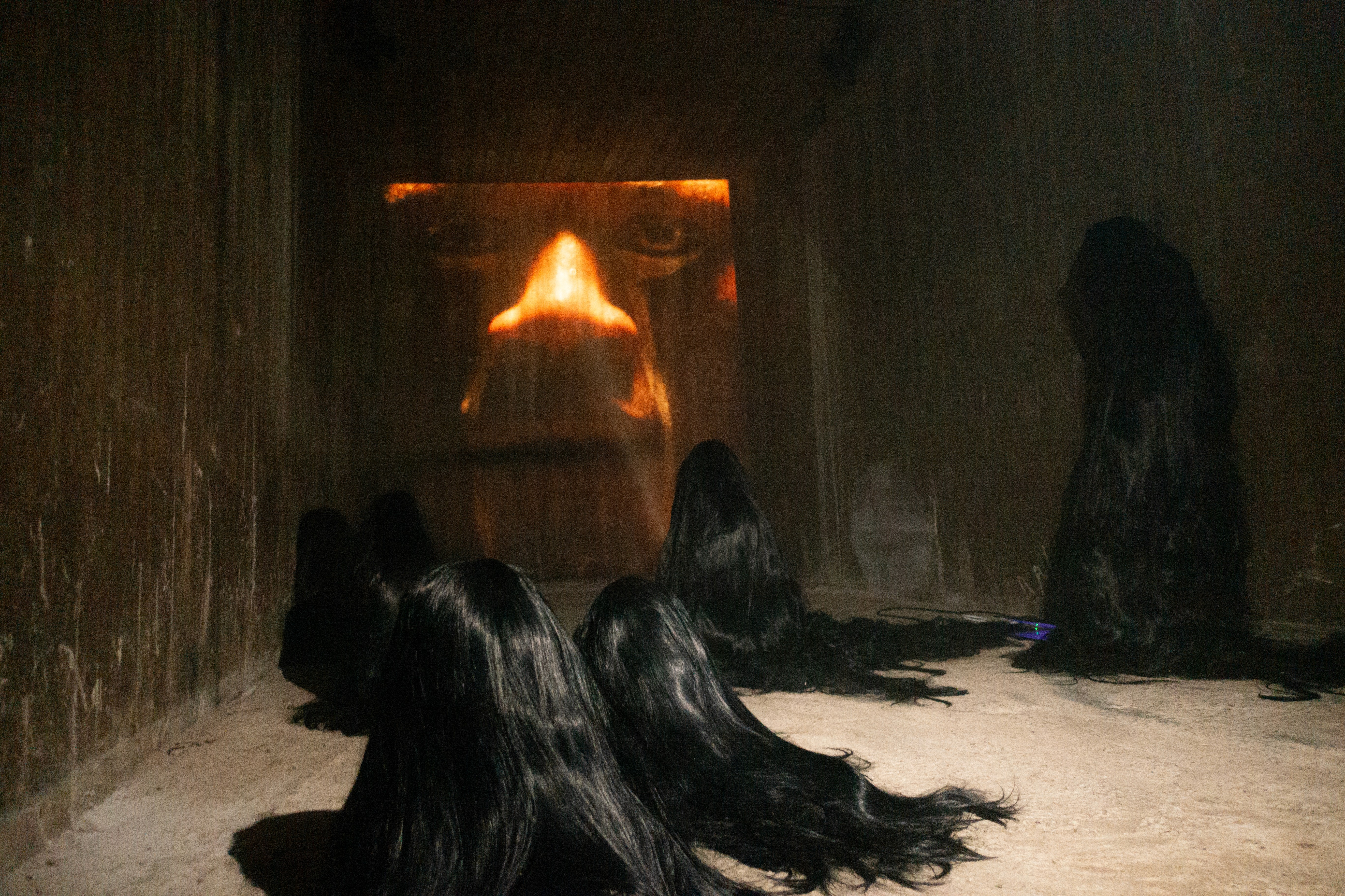 :solid shadows made of hair by japanese artist @hayatemaeda were dispersed throughout the space, creating a sense of an unknown presence—something yet to be unveiled.